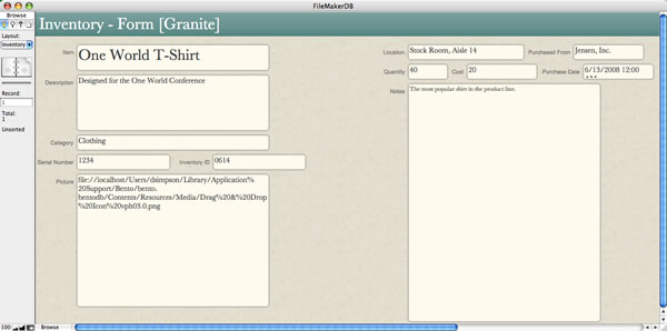 FmPro Migrator displays progress dialogs as the Bento Backup file is being read and processed. Bento Libraries and related tables are converted into compatible FileMaker Pro database tables. Relationships are read and converted into new (simplified) FileMaker Pro relationships. Each Bento Form is read and converted into a FileMaker Pro Layout matching the theme used on the original Bento form. Field labels are arranged to the left of each field, with each field created having the original field background color and text font. The following screenshots show the original and converted versions of a Bento Inventory Library form:
